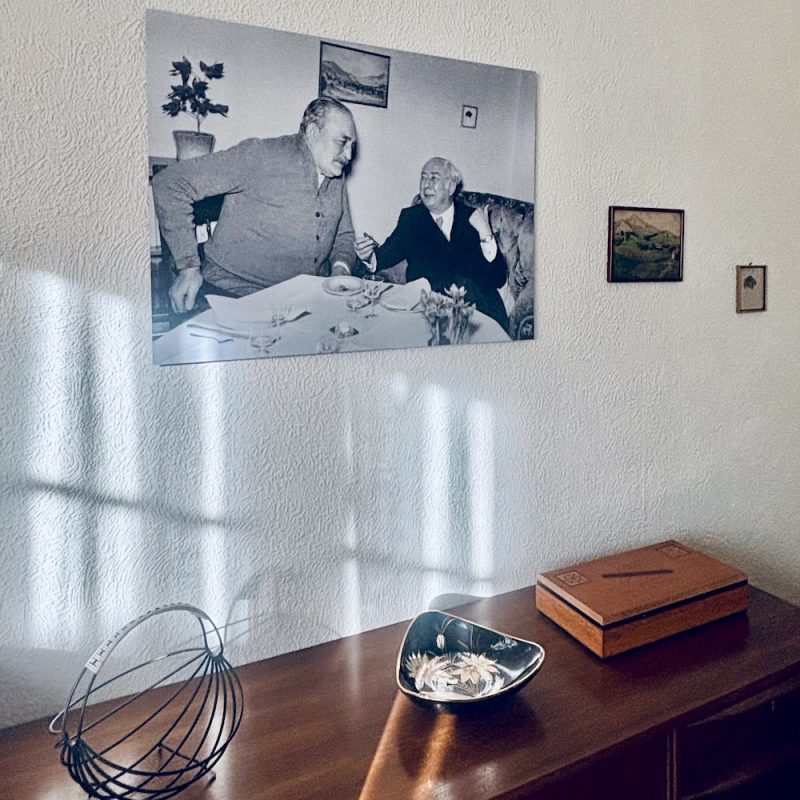 Übrigens: Vor genau 74 Jahren – am 8. Februar 1952 – besuchte Bundespräsident Theodor Heuss auf seinem Staatsbesuch in Bremen auch die Siedlerstelle der Kaisens. Da Bürgermeister Kaisen erkrankt war, ließ Heuss es sich nicht nehmen, zu ihm nach Hause in Borgfeld zu fahren. Der Präsident (begleitet von Sicherheitspersonal, Fahrer und Pressefotografen) nahm sich Zeit für einen ausführlichen Rundgang über die Hofstelle, bevor er sich im kleinen Wohnzimmer der Siedlerstelle bei „Kaffee und Korn“ niederließ und mit Kaisen unter vier Augen über politische Themen sprach (siehe Foto).
