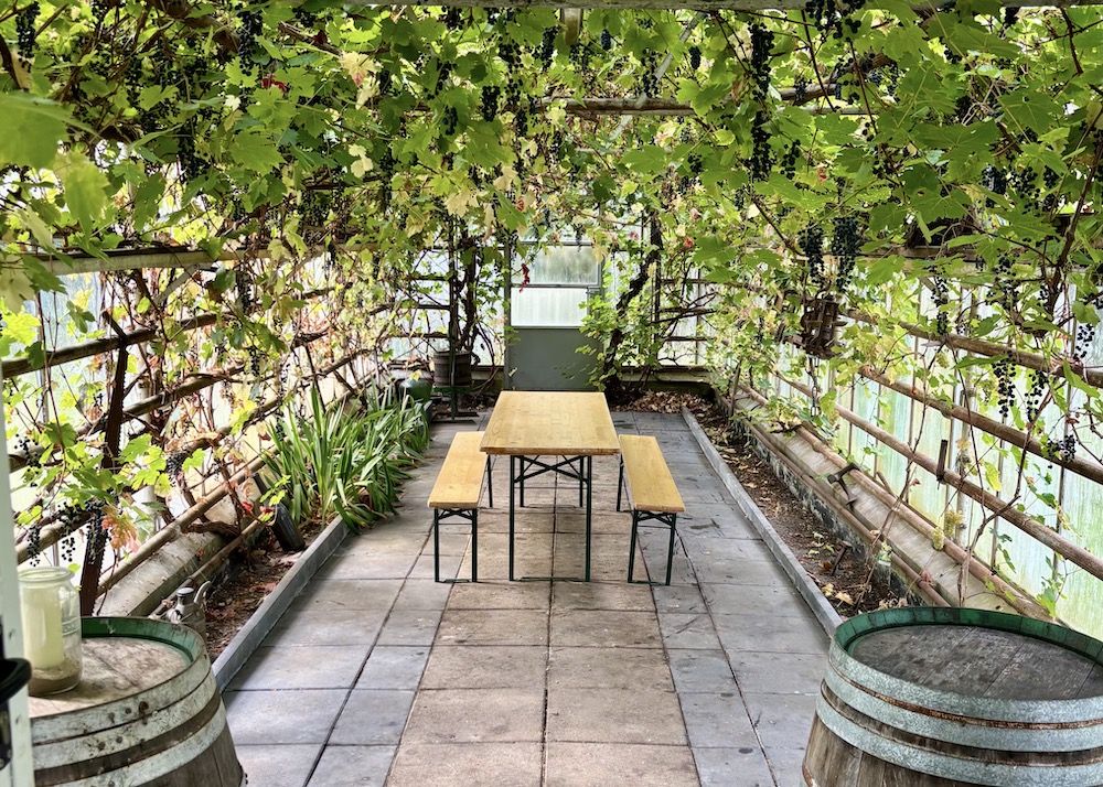 Über den Tag verteilt nutzten die Besucherinnen und Besucher die Gelegenheit, die Gebäude der ehemaligen Siedlerstelle von Wilhelm Kaisen und seiner Familie zu besichtigen. Im historischen Gewächshaus hatte der Wein-Freundeskreis die Reben extra noch nicht abgenommen und lud alle zum Traubennaschen ein. „Die schmecken ja fast wie Rosinen“, lautete das einhellige Urteil. Auch vom Kaisen-Wein, Jahrgang 2023 durfte gekostet werden, ein sehr fruchtiger Rosé mit immerhin 11 Prozent.