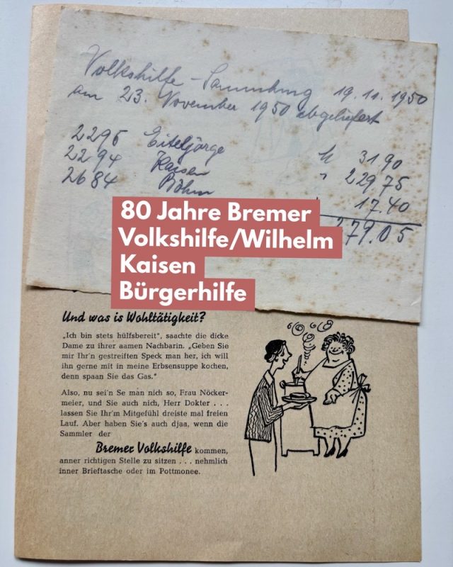 In unserer Sondervitrine zeigen wir aktuell Unterlagen aus dem Privatnachlass der Familie Kaisen zur Bremer Volkshilfe. „Jetzt kommt es vor allem darauf an, die private Fürsorge wieder aufleben zu lassen.“ Mit diesen Worten wandte sich Wilhelm Kaisen, damals Wohlfahrtssenator im ersten Bremer Nachkriegssenat, am 13. Juni 1945 an die Öffentlichkeit. Daraus folgte am 1. Oktober 1945 die Gründung der Bremer Volkshilfe, eine Dachorganisation, die darauf ausgerichtet war, notleidende Menschen in Bremen mit Geld- und Sachspenden zu unterstützen. Dazu hatten sich Diakonisches Werk, AWO, Caritas, Paritätischer Wohlfahrtsverband, Deutsches Rotes Kreuz und Jüdische Gemeinde überkonfessionell zusammengeschlossen.